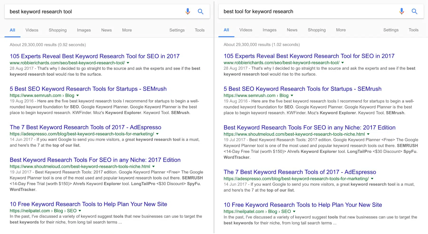 Aujourd’hui, RankBrain comprend que ces termes sont fondamentalement les mêmes. Donc, ils montrent des résultats de recherche presque identiques.