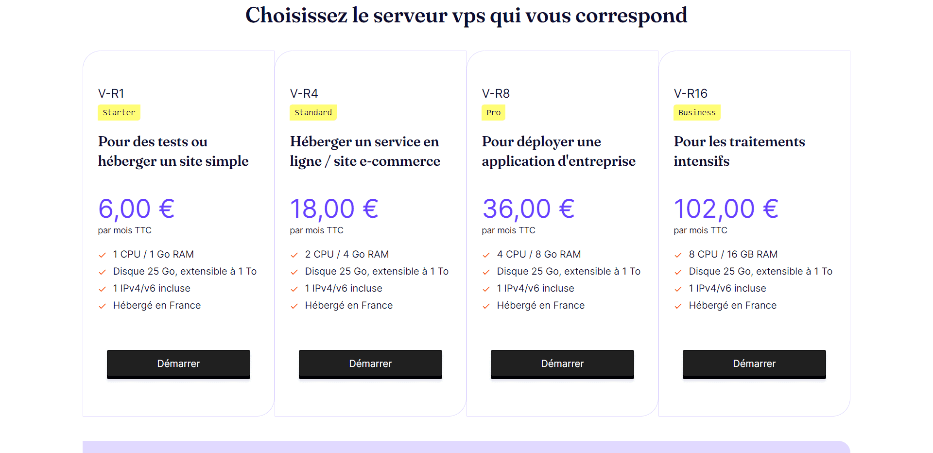 - Le serveur V-R16, à 102€ / mois, destiné à un usage intensif de votre serveur VPS, idéal pour les professionnels du web.