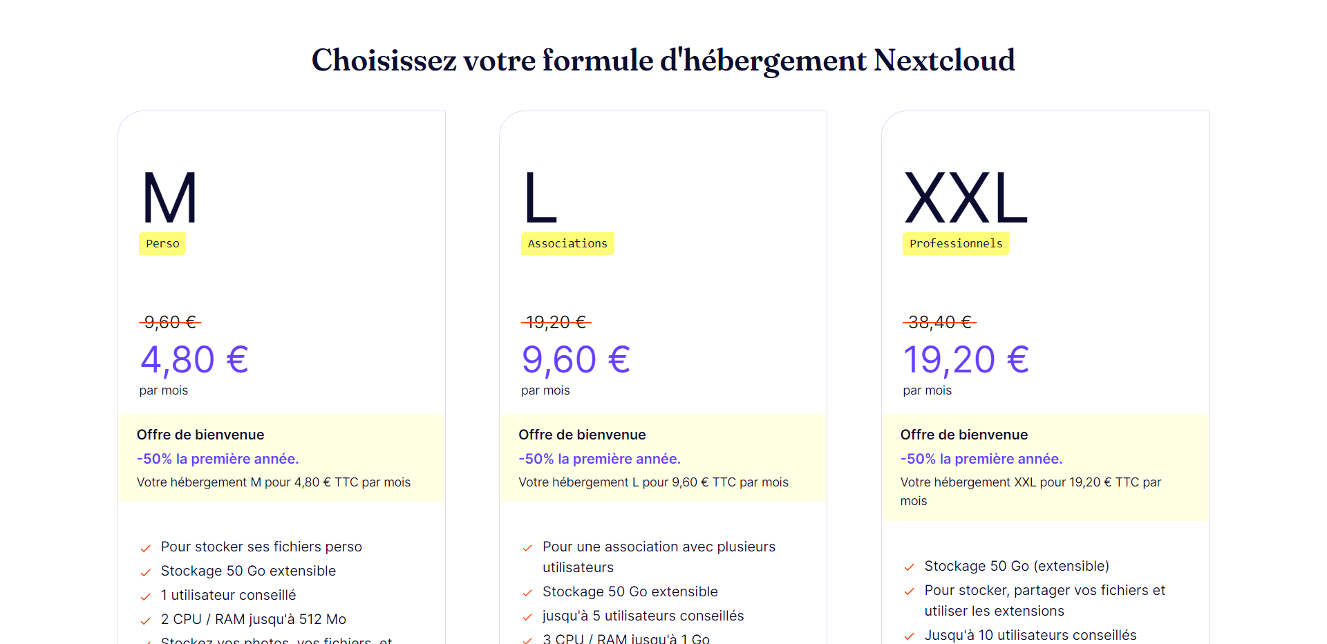 - L’offre L à 19,20€ / mois, -50% la première année, pensée pour les associations et les petites organisations, afin de sauvegarder et de partager des fichiers importants.