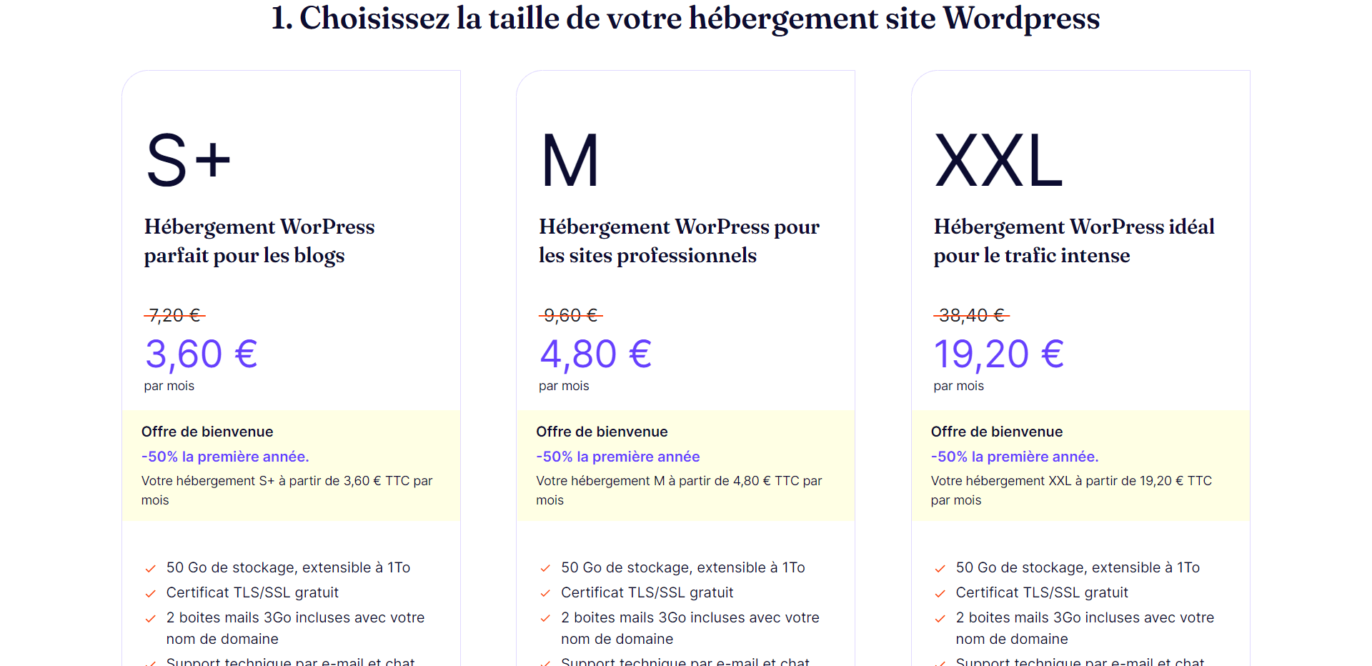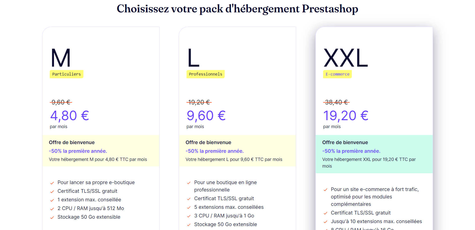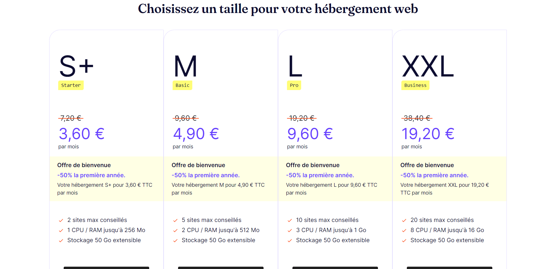 - L’offre XXL à 38,40€ / mois, -50% la première année : Pour les sites professionnels au trafic plus dense.