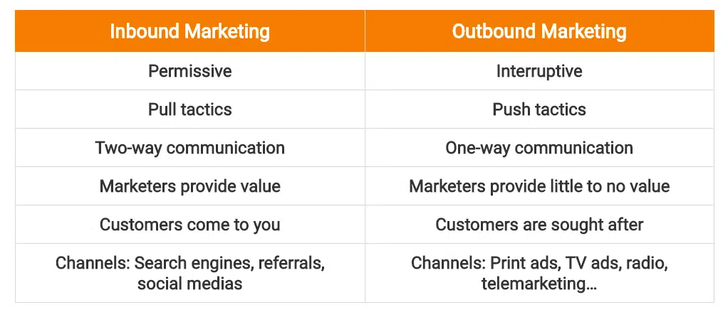 On voit toute la différence entre les deux approches. Tandis que l’Outbound marketing va chercher le client, en poussant des messages sur les canaux adéquats, l’Inbound marketing cherche à attirer les clients à soi. Ce n’est plus l’entreprise qui va vers ses clients potentiels. Ce sont les clients potentiels qui sont attirés vers l’entreprise, via des contenus. Le symbole de l’Inbound marketing, c’est l’aimant. Celui de l’Outbound marketing, c’est le haut-parleur.