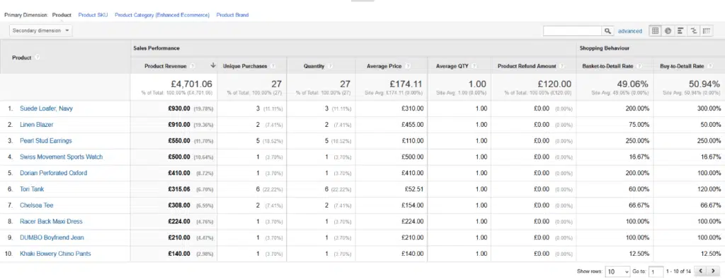 Pour une analyse approfondie de votre catalogue de produits et de son attractivité, le tracking ecommerce amélioré permet d’étudier la manière dont chacun de vos produits sont consultés, ajoutés, et achetés au sein de votre entonnoir de conversion, à l’aide du rapport « Shopping Behaviour ».