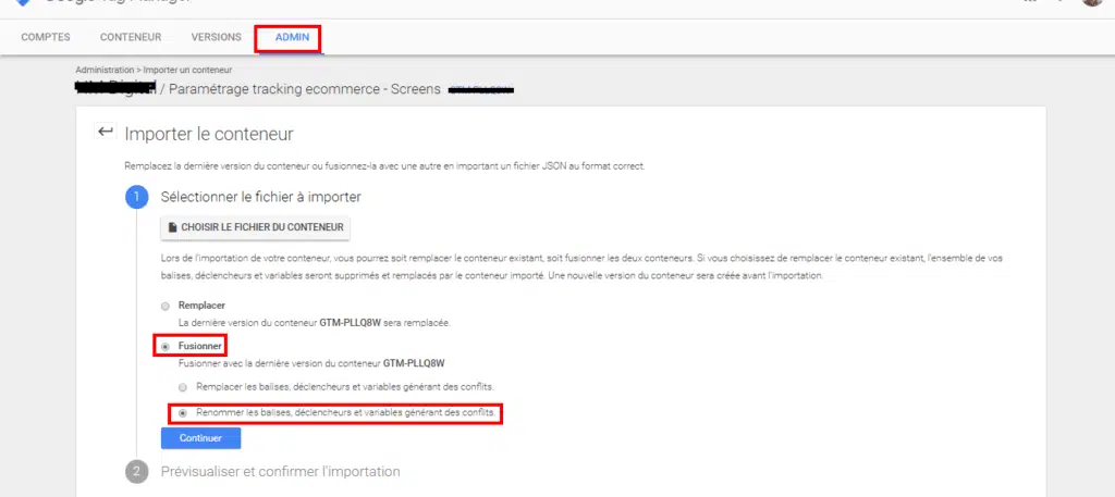 Ouvrez (ou créez) votre conteneur Google Tag Manager et accédez à l’onglet “Administration”. D’ici, vous pourrez importer le conteneur du kit d’installation pour utiliser ses variables, déclencheurs et balises.