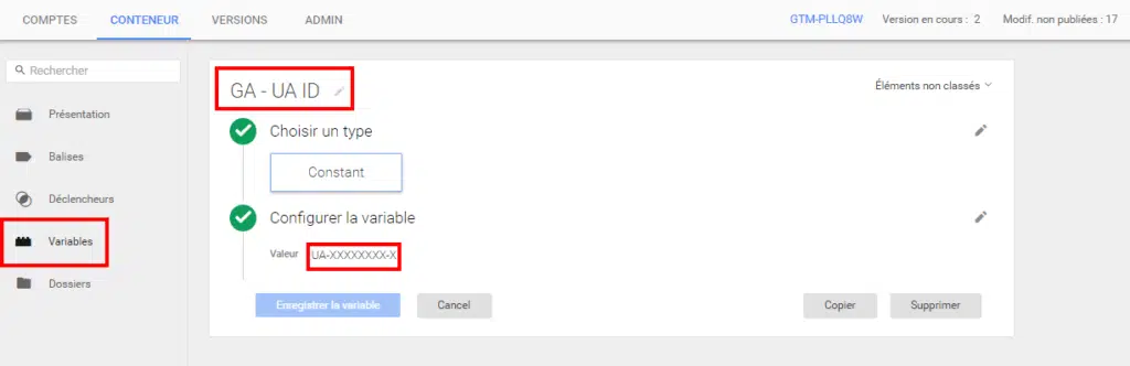 Une fois l’import du conteneur ecommerce effectué, mettez à jour la variable correspondant à l’identifiant de votre propriété Google Analytics 4 (GA4), afin d’assurer l’envoi des données vers la bonne propriété.