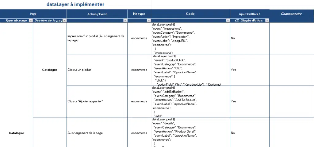 Attention : La structure des “dataLayer.push” qui doivent être générés pour assurer le bon fonctionnement du tracking du commerce électronique amélioré est définie de manière précise par Google et dans ce plan de taggage. Elle doit être strictement respectée pour garantir le bon fonctionnement des rapports.