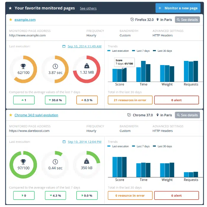 Mais DareBoost c’est surtout la capacité de surveiller votre site (monitoring). Que vous ajoutiez des contenus, que vous fassiez des mises à jour de vos outils, ou que vous modifiez techniquement votre site : cela peut provoquer des régressions de qualité ou avoir des impacts très importants en terme de temps de chargement. DareBoost, en analysant régulièrement votre site, vous enverra une alerte dès lors qu’un problème est détecté. Nous adressons également la problématiques des services tiers (widgets sociaux, etc) qui manquent trop souxvent de fiabilité et dont il est essentiel de mesurer les impacts pour pouvoir agir en conséquence.