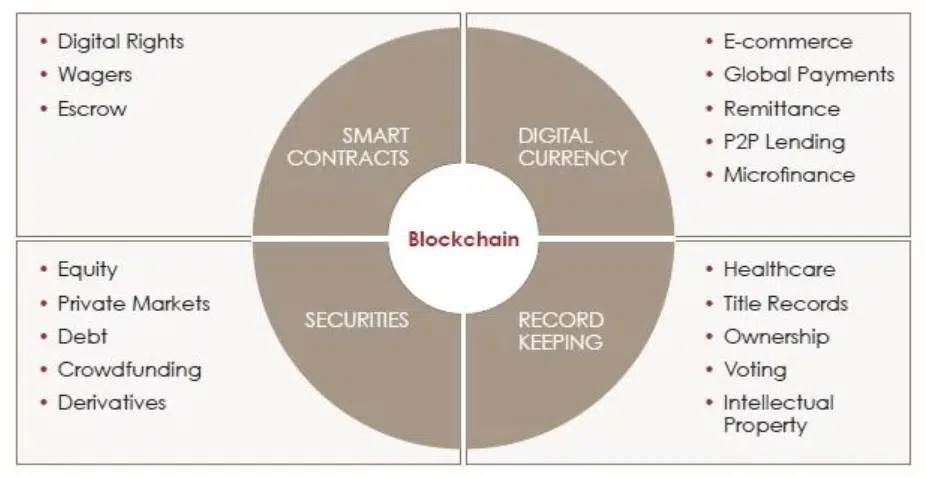 Comme le montre le schéma ci-dessous, la blockchain a de nombreuses applications autour des smart contracts, des monnaies numériques, de la sécurisation des transactions et de l’enregistrement des données.