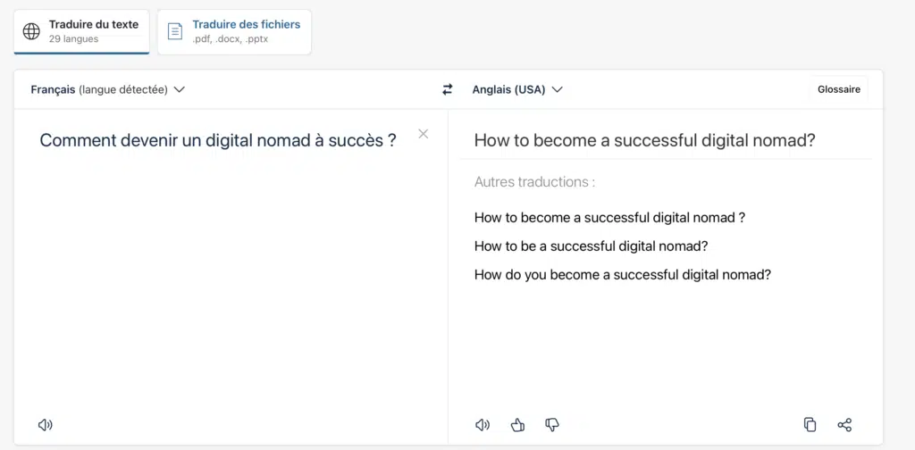 Le digital nomad bouge et a un besoin d’un outil capable de lever les barrières de la langue. Même pour les plus à l’aise en anglais ou espagnol, il n’est pas toujours simple d’aborder certains sujets dans une langue étrangère, notamment ceux professionnels. Contrairement à d’autres traducteurs numériques instantanés, DeepL se démarque par son grand degré de précision, sa cohérence et la diversité des langues qu’il prend en charge.