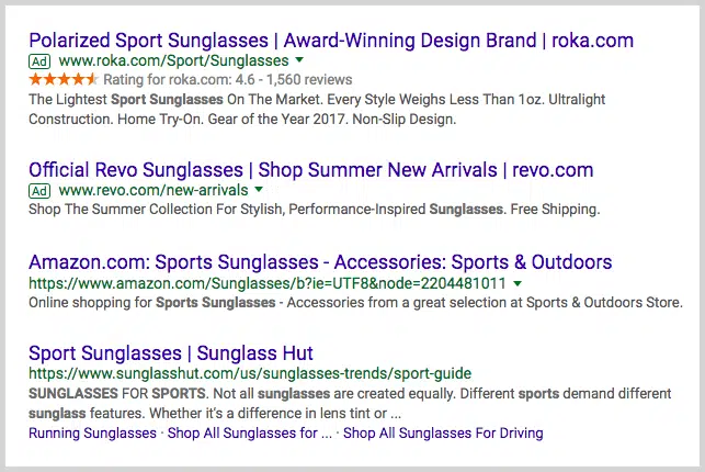 Lorsque les publicités natives sont apparues dans les résultats de recherche, elles étaient révolutionnaires. Elles offraient aux spécialistes du marketing un moyen facile d’atteindre les consommateurs à la recherche de produits spécifiques. Ils ont permis aux spécialistes du marketing de passer directement au bas de l’entonnoir. Par exemple, ces résultats de recherche Google pour les lunettes de soleil sportives, incluent deux publicités natives en haut, suivies des résultats de recherche organiques.