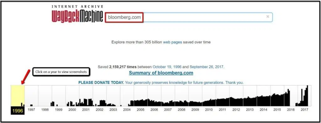Le passé compte sur Internet. Pour découvrir à quoi ressemblait un domaine expiré et comprendre son activité précédente, utilisez Internet Archive. Il s’agit d’un service de stockage gratuit qui revient en arrière pour retracer l’historique d’un domaine expiré. Entrez simplement le domaine dans le champ de recherche et il vous montrera sa chronologie depuis l’année où il a commencé: