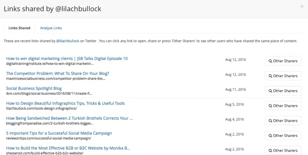 Lorsque vous avez identifié un influenceur, vous pouvez voir les liens qu’il a partagé récemment en cliquant sur « links shared » à le droite de son nom.