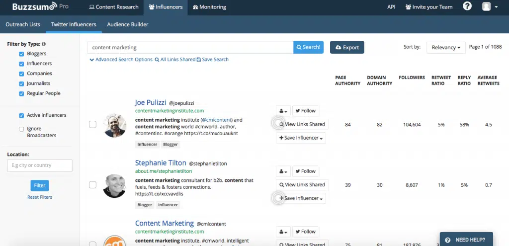 A partir de là, BuzzSumo vous propose une liste d’influenceurs. Vous pouvez filtrer les résultats pour trouver les influenceurs les plus pertinents en utilisant les options de filtrage proposées à gauche de l’écran. Vous pouvez filtrer les influenceurs par zone géographique (ville / pays), par type d’influenceurs (blogeurs, journalistes, entreprises, particuliers…). Vous pouvez aussi classer les résultats en fonction du critère de votre choix (la pertinence par exemple, ou le niveau d’autorité des influenceurs), en utilisant la fonction « Sort By » en haut à droite de la page de résultats. A noter que vous pouvez utiliser plusieurs mots-clés pour faire vos recherches, en tapant « OR » entre les deux mots-clés. Vous pouvez aussi rechercher un influenceur en particulier en tapant « @ » suivi du nom de l’influenceur.