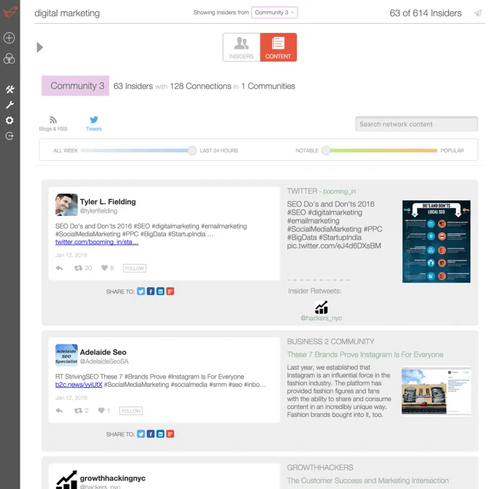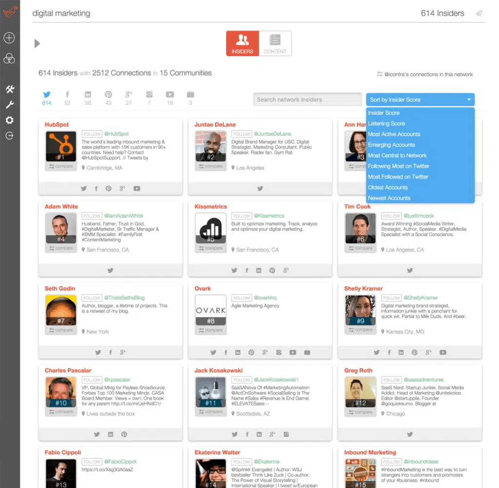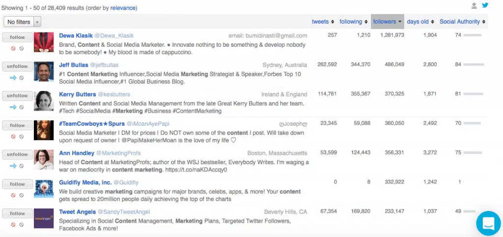 Ce qu’il a de particulièrement intéressant c’est que vous pouvez rechercher des influenceurs par thématique ou par zone géographique (par pays et/ou par ville), et ensuite les classer en fonction de la taille de leur audience, de leur autorité, de leur niveau d’influence et du niveau d’engagement qu’ils suscitent de la part des personnes qui les suivent. Vous pouvez aussi utiliser BuzzSumo pour suivre en temps réel les contenus que les influenceurs que vous avez identifié publient ou partagent.