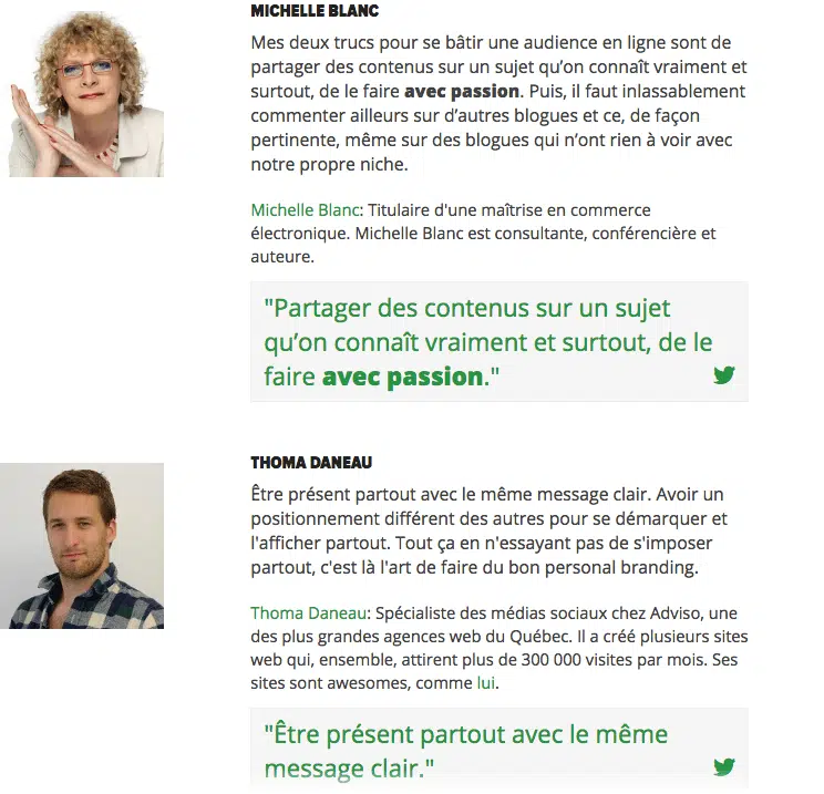C’est du gagnant-gagnant : les influenceurs obtiennent des backlinks, des partages et de l’engagement et n’ont, en échange, qu’à écrire quelques lignes. De votre côté, cela permet de gagner en visibilité car l’article sera beaucoup partagé sur les réseaux sociaux. Pour obtenir le maximum de réponses de la part des influenceurs, n’hésitez pas à envoyer la question à un maximum d’influenceurs – idéalement à tous ceux de votre liste. Expliquez dans votre message que vous ajouterez un lien vers leur site et/ou leurs comptes sociaux, une petite description et une photo dans l’article. Une fois l’article rédigé, faites-le savoir aux influenceurs qui ont accepté de jouer le jeu pour qu’ils le partagent sur leurs réseaux sociaux.