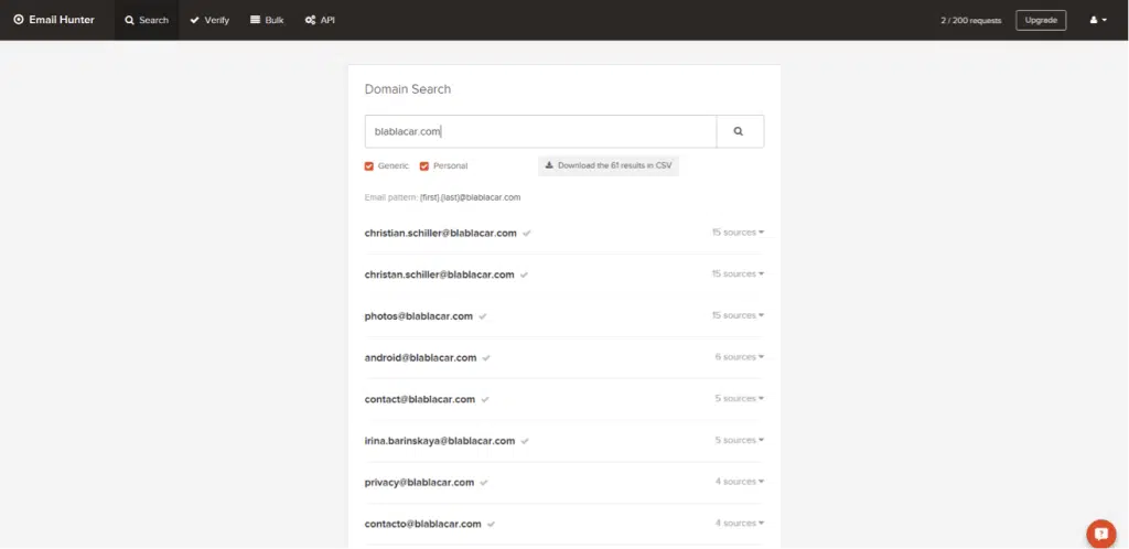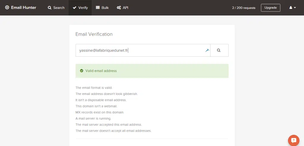 Cet outil est souvent très efficace pour trouver le format des emails pour les entreprises de taille moyenne. Par contre, c’est souvent beaucoup moins performant pour les petites sociétés. A noter que vous avez le droit à 200 requêtes gratuites par mois. EmailHunter permet aussi de vérifier la validité des emails, comme nous le verrons tout à l’heure.