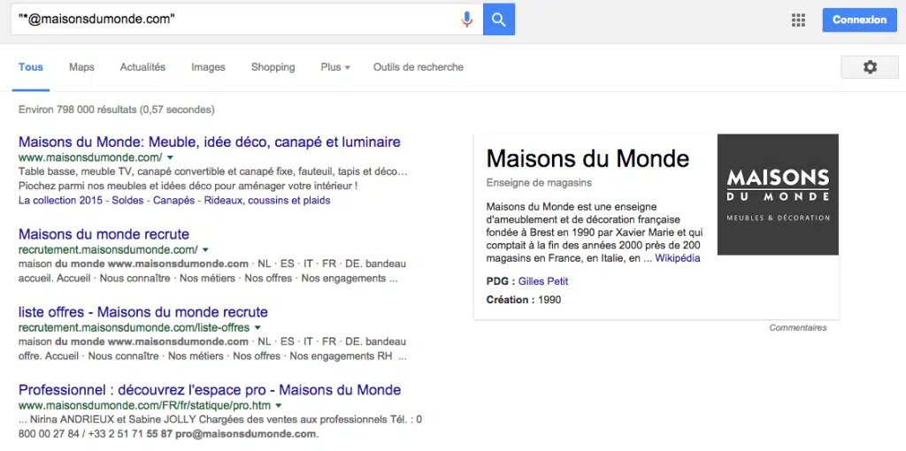 Une fois que vous avez récupéré le nom de domaine, tapez « *@nomdedomaine » dans Google (avec les guillemets). Cela vous permettra d’accéder à toutes les adresses emails ayant derrière l’arobase le nom de domaine référencé dans Google (ou autres : vous pouvez faire la manip sur d’autres moteurs de recherche). Pour reprendre notre exemple, on tape « *@maisondumonde.com » :
