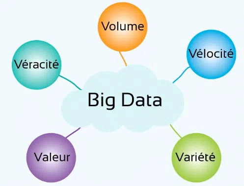 En cela, on trouve : le Volume des données, leur diversité (Variété), leur vitesse de génération et de traitement (Vélocité), leur changement constant (Variabilité) ainsi que leur potentiel à apporter des bénéfices (Valeur).