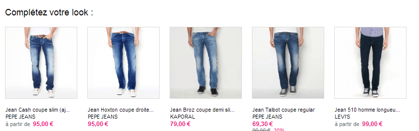 Il s’agira ensuite de choisir un wording approprié en fonction notamment de l’emplacement de la zone de cross-sell (page produit, page panier, …) et du lien existant entre les produits proposés et le produit intéressant l’internaute. Les wordings usuels vont du simple et obscur « Produits connexes » à des choses plus… longues comme « Les clients ayant acheté cette article ont également acheté ». Si possible on essaiera d’ajouter une touche de contexte un soupçon d’identité de marque pour personnaliser le wording : exemple chez La Redoute avec leur formulation très prêt-à-porter « Complétez votre look » sur une fiche produit de vêtement.