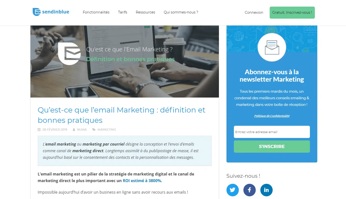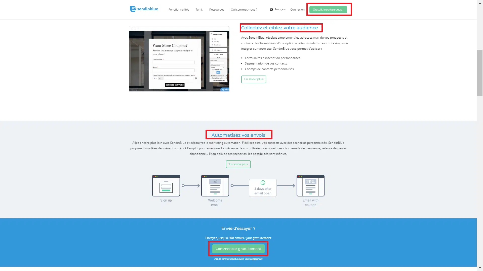 Voici un autre exemple (SendinBlue) où l’on retrouve une belle organisation des contenus, avec des titres clairs, le tout accompagné de CTA bien pensés (avec une hiérarchie entre les CTA) :