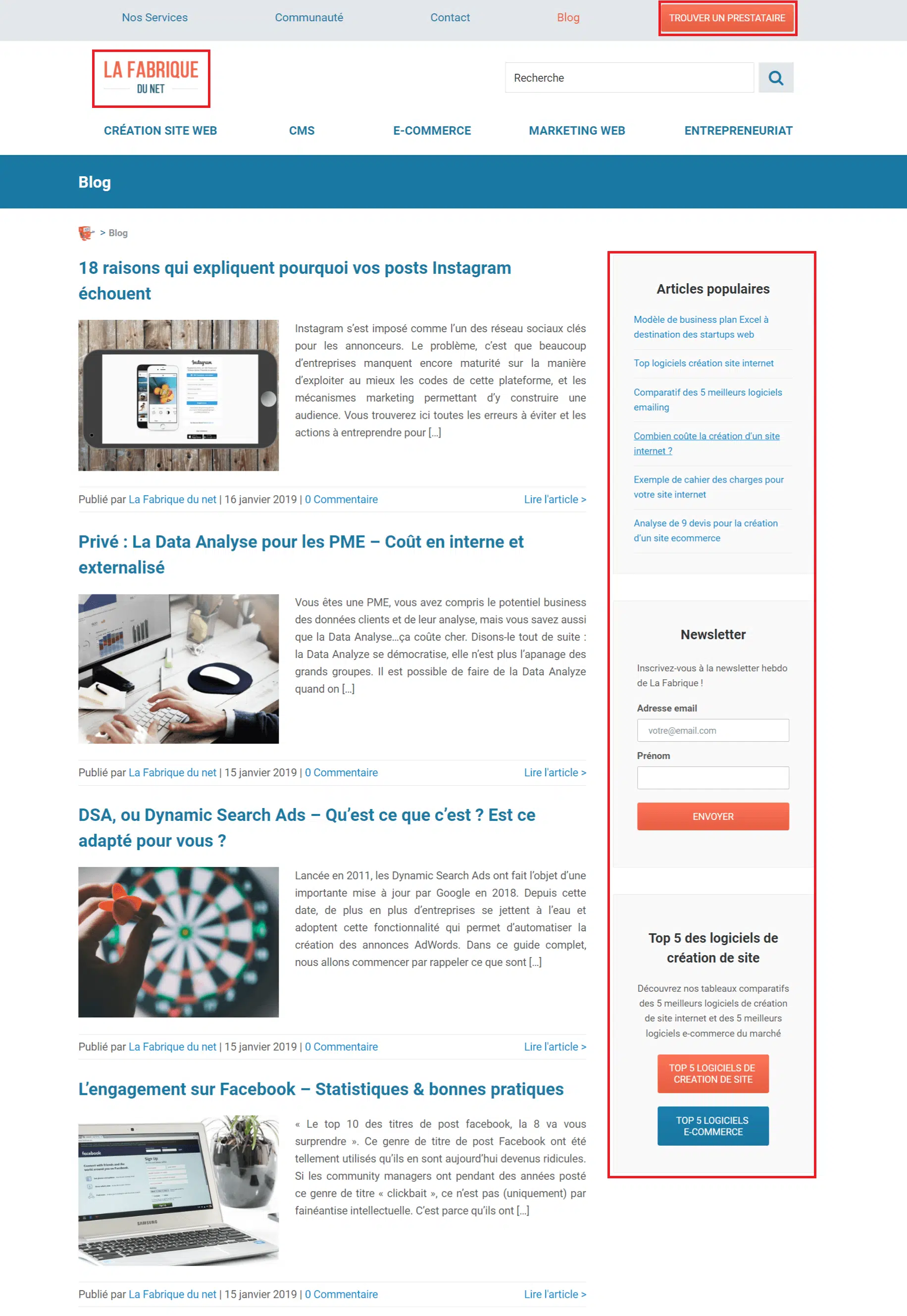 Voici maintenant l’exemple du site…La Fabrique du Net, juste pour le plaisir de la mise en abyme, mais aussi parce que la structuration de la page est objectivement efficace :