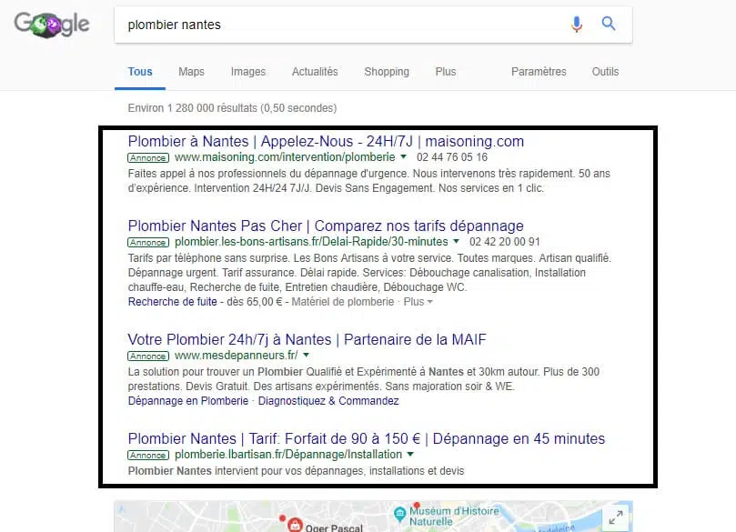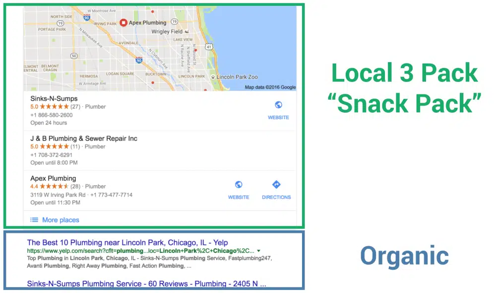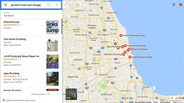 Comme vous pouvez le constater, les résultats de recherche sont 100% payants. Avec le temps, Google insère de plus en plus d’annonces dans les résultats de recherche locaux. C’est donc un objectif que vous souhaitez surveiller. En prenant les résultats de recherche pour un plombier à Chicago, après les annonces payantes, voici ce que nous trouvons :