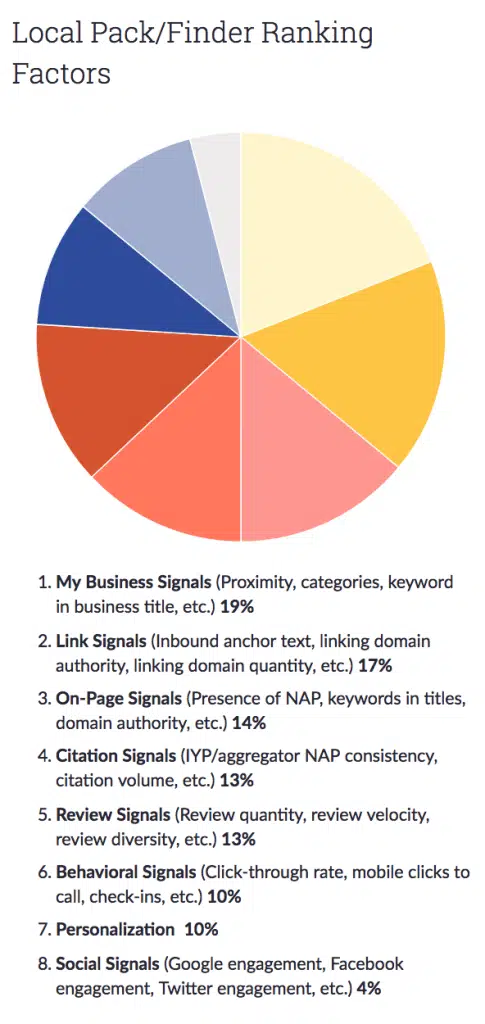 Il s’agit de la section située sous la carte dans les résultats organiques. Grâce à l’étude annuelle sur les facteurs de classement local, voici les facteurs les plus importants :