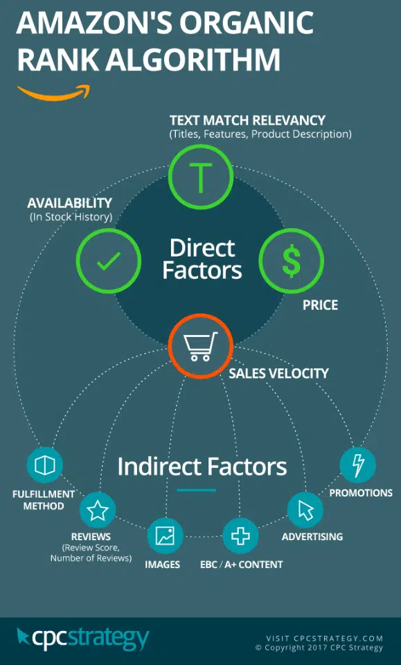 L’infographie ci-dessous présente quelques uns des facteurs utilisés par les algorithmes d’Amazon pour référencer les résultats :