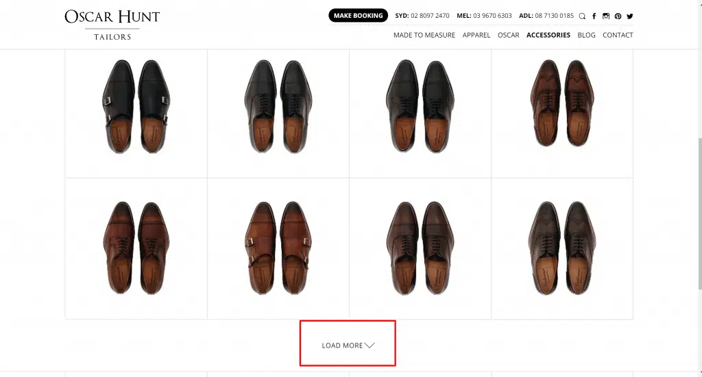 L’exemple d’Oscar Hunt montre le bouton «Charger plus» au lieu du bouton typique 1,2,3 >>. Lorsque vous achetez des chaussures, consulter l’ensemble de l’inventaire de chaussures sur une seule page peut être une meilleure option que de parcourir plusieurs pages pour trouver le bon produit.