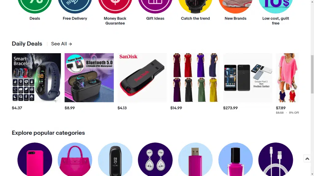 Remplacez les URL par les URL de votre site. La balise canonique aidera les robots à se rendre compte que toutes les autres pages avec pagination font partie de la page « Voir tout ». Il n’y a donc pas de contenu en double. Il est impératif que la page « Voir tout » se charge rapidement. Idéalement, selon le nombre de produits que vous possédez, vous souhaitez les diviser en catégories si vous avez plusieurs produits. Un bon exemple est l’exemple d’eBay où la page « Voir tout » affiche uniquement les offres du jour :