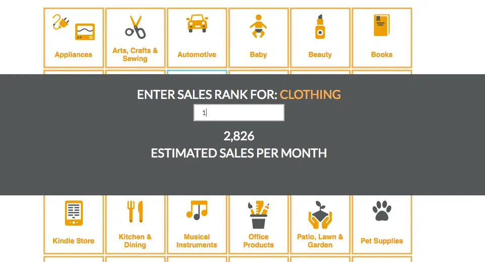 À nouveau, utilisez Jungle Scout pour estimer le nombre de produits vendus par mois en fonction du classement. Par exemple, un produit qui est classé numéro 1 dans la catégorie « Clothing » se vend, selon l’estimation, 2 826 fois par mois :