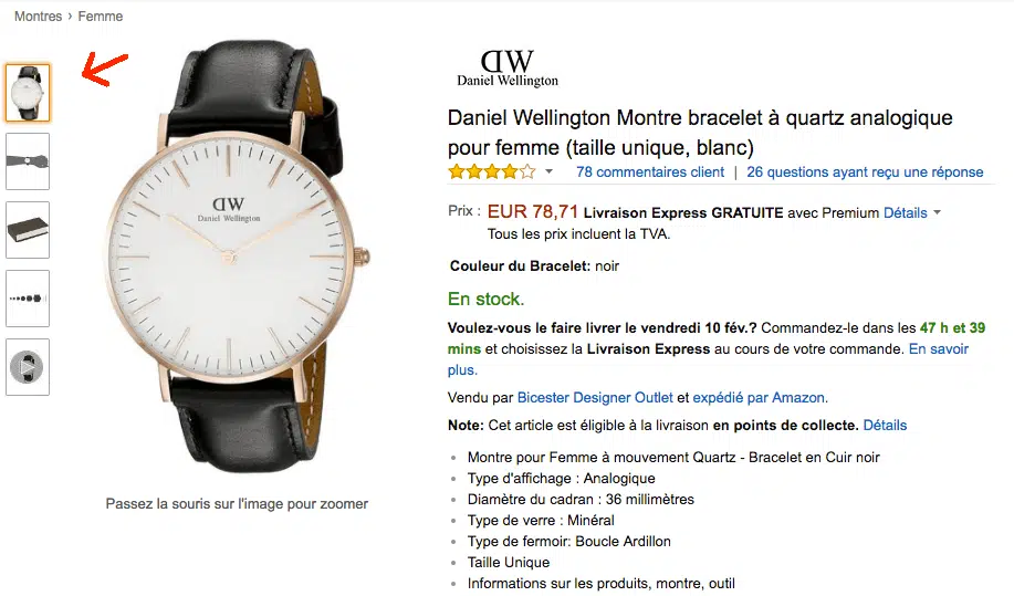 L’image principale de votre produit, c’est celle qui apparaît dans les pages de résultats d’Amazon. C’est aussi celle qui s’affiche en haut à gauche de votre page produit. C’est la première chose qu’un internaute voit et c’est sûrement l’élément le plus important de votre page produit. Vous devez donc soigneusement choisir l’image principale.