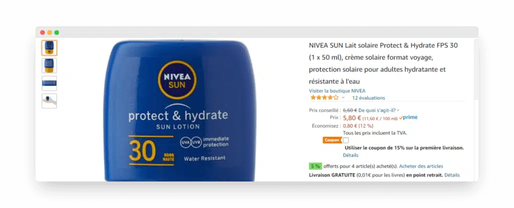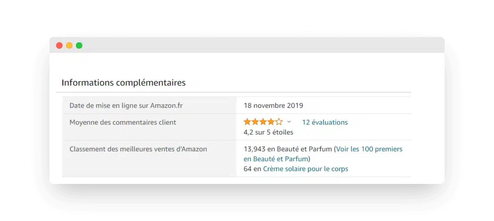 Vous pouvez utiliser directement Amazon et rechercher les meilleures ventes de produits similaires au vôtre sur la plateforme. Si vous vendez de la crème solaire, recherchez ce produit et cliquez sur les premiers résultats. Vous aurez de nombreuses informations sur vos concurrents, ce qu’ils vendent, les prix pratiqués, les bénéfices mis en avant, les commentaires clients.