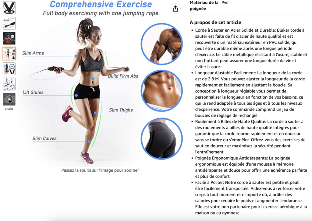 Les e-acheteurs s’intéressent bien évidemment aux caractéristiques des produits. Mais ce qui les intéresse par dessus tout, ce sont les bénéfices produits. Pourquoi votre produit est-il fait pour lui ? Quelles sont ses fonctionnalités ? Quels sont ses usages ? Quel problème résout-il ? Lorsque vous décrivez votre produit – sous forme de bullet points par exemple – faites transparaître les bénéfices plus que les caractéristiques. Attention, évitez d’adopter un ton trop robotique ou trop commercial. Dans l’exemple ci-dessous, le vendeur met bien en avant les bénéfices du produit : « durable même après une longue période d’exercice », « adaptée à tous les âges et tous les niveaux d’expérience », etc.