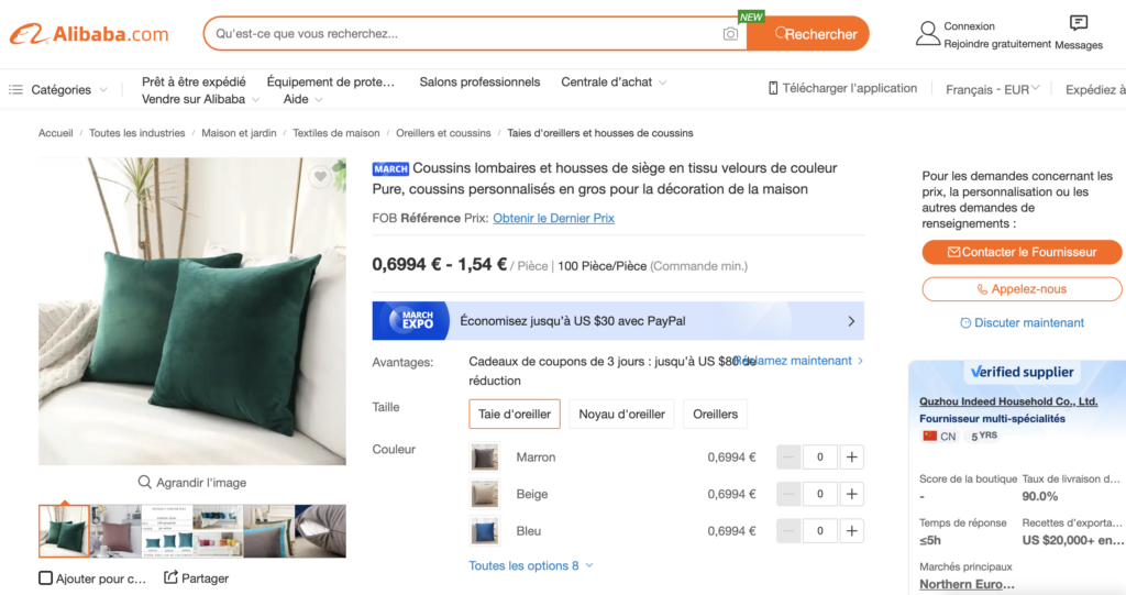 Pour trouver des fournisseurs sur Alibaba, rendez-vous sur la plateforme et tapez le nom de votre produit. Vous verrez qu’elle se présente comme une marketplace classique. Voici un exemple pour des coussins de salon :