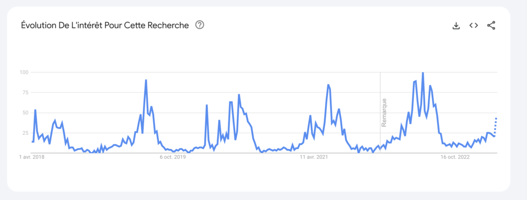 Sachez que Google Keyword Planner ne permet pas de savoir si les produits de votre liste sont saisonniers ou pas, c’est-à-dire s’il y a des variations de demandes au cours de l’année. Or, c’est une question importante pour constituer vos stocks et prévoir votre stratégie marketing. Google Trends reste un outil efficace pour estimer les variations de demande produits, mais il peut être complété par des outils spécialisés Amazon comme Helium 10 ou Jungle Scout pour une analyse plus fine du marché sur la marketplace. Voici le résultat obtenu pour la requête « Crème solaire » en France sur 5 ans :