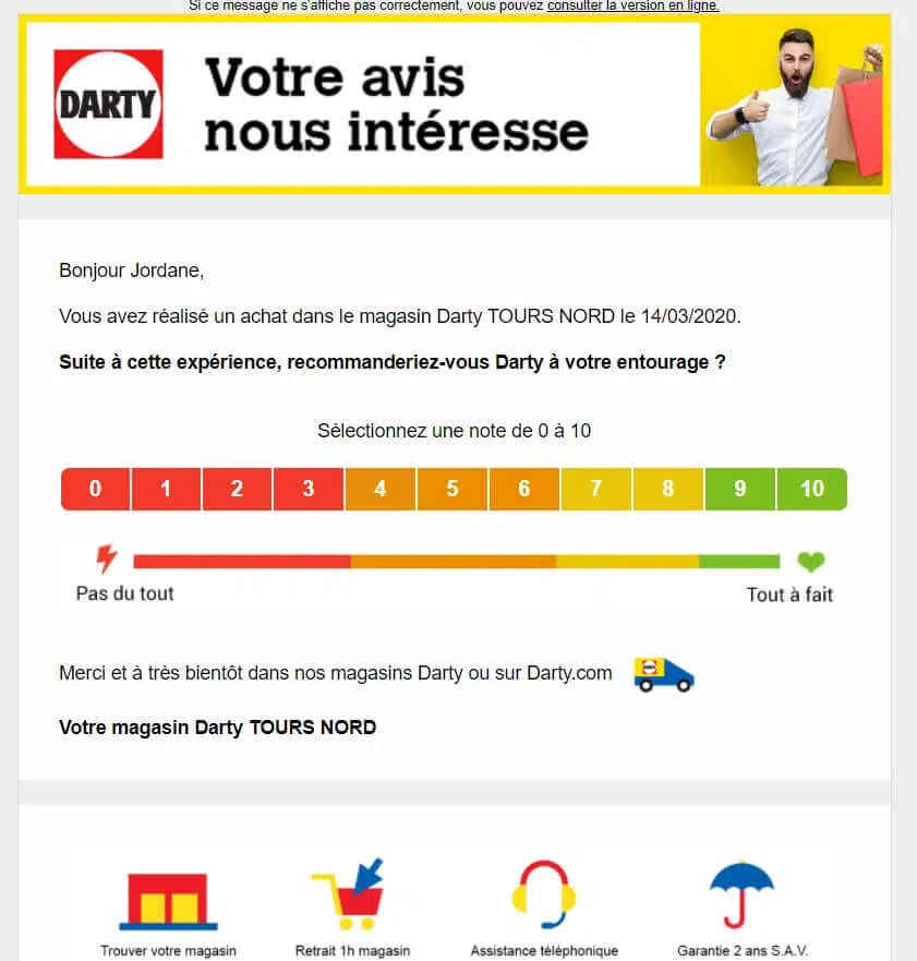 Dans le cas d’un site e-commerce, on peut imaginer mettre en place un message automatisé afin d’avoir un retour du client sur le produit commandé (Livraison J+7 par exemple). L’avis de vos clients est essentiel, d’autant plus lorsqu’il a pris le temps d’écrire une « review » positive du produit que vous pourrez mettre en avant sur la page du produit en question.