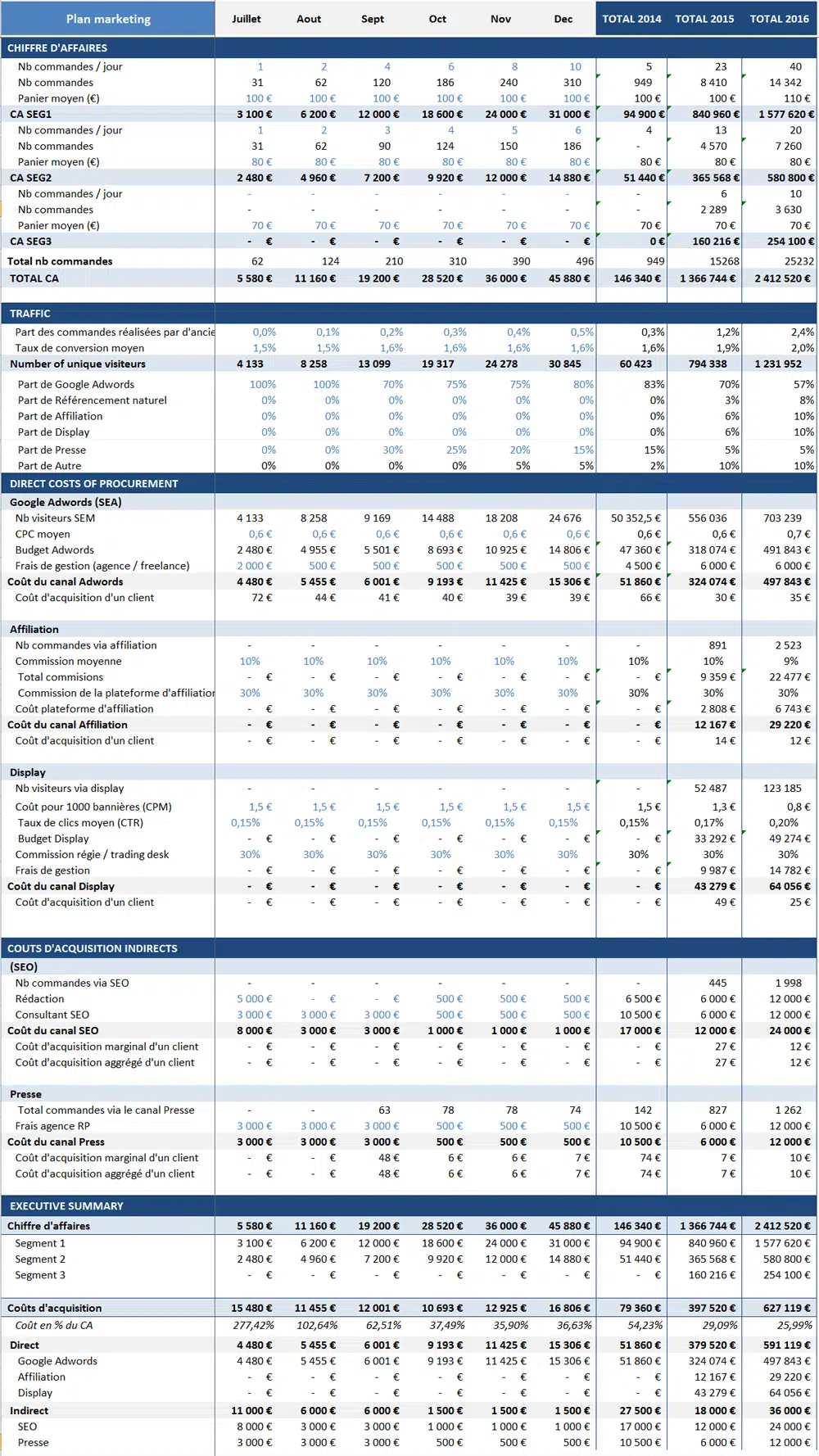 Le prévisionnel ne sera pas respecté dans le détail, et il ne doit pas l’être, le plan marketing ne doit jamais empêcher un porteur de projet d’être pragmatique. L’intérêt d’un budget prévisionnel est d’une part dans la démarche d’analyse qui va vous amener à décomposer votre CA et vos coûts de tel ou tel manière, et d’autre part dans le travail de veille nécessaire pour évaluer à peu près correctement les principales hypothèses, notamment au niveau des coûts d’acquisition.