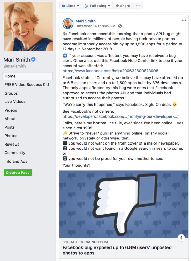L’audience suscitée par l’engagement de Facebook devrait également inclure des messages tout simplement utiles. Vous ne voulez pas épuiser les gens qui demandent sans cesse plus de temps, d’attention ou d’argent. Voici un exemple tiré de la page Facebook de Mari Smith. Elle a publié un article sur une atteinte à la sécurité de Facebook qui aurait peut-être permis un accès non autorisé à des photos à partir de calendriers. Elle propose de très bons conseils sur les types de photos à éviter de poster en ligne.