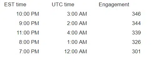 Maintenant, la plupart des spécialistes du marketing savent que cette question est difficile à généraliser. Chaque public cible est différent et, par conséquent, ces chiffres globaux peuvent ne pas fonctionner pour vous. Cependant, cela ne fait pas de mal de les regarder et de les utiliser comme point de départ si vous n’avez pas d’autres données. Les horaires optimaux pour publier peuvent varier fortement selon votre audience et leur fuseau horaire. Il est recommandé d’utiliser les outils d’analyse intégrés à Facebook (Meta Business Suite) pour identifier les moments où votre communauté est la plus active. Votre public peut être différent, alors assurez-vous de tenir compte de leur routine quotidienne et de vous adapter aux moments où ils surfent sur leurs réseaux sociaux. Vous trouverez ci-dessous une liste des moments optimaux pour publier en fonction de l’engagement moyen :