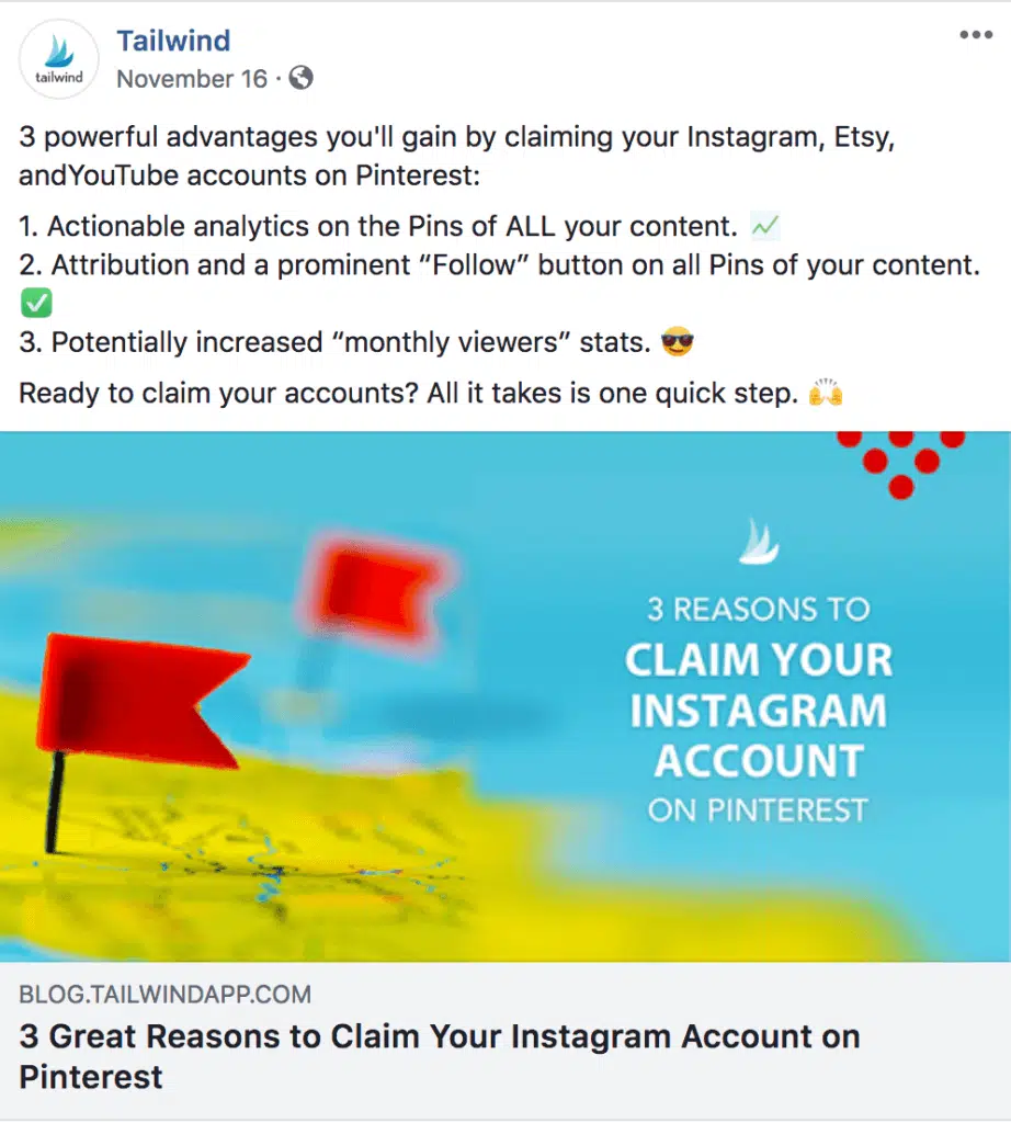 Et, cet article de TailwindApp offre de la valeur en suggérant que trois types de comptes devraient (et peuvent être) réclamés sur Pinterest. L’appel à l’action n’a pas besoin d’être plus explicite ici car la publication elle-même justifie le fait de cliquer sur le lien.