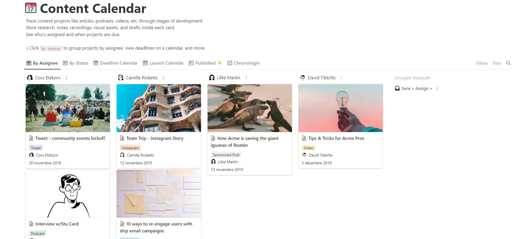 Utilisez ce calendrier de contenu pour planifier et suivre tout le contenu que vous diffusez, des articles de blog aux podcasts en passant par les publications sur les réseaux sociaux (posts LinkedIn, Instagram, TikTok, etc.). Chaque élément du calendrier est un projet, dans lequel vous pouvez désigner l’auteur (ou la personne désignée), le type de contenu (article, événement, etc.) et son statut (prévu, en cours, terminé). Sans être un logiciel de mind mapping, cela donne une bonne visualisation des next step.