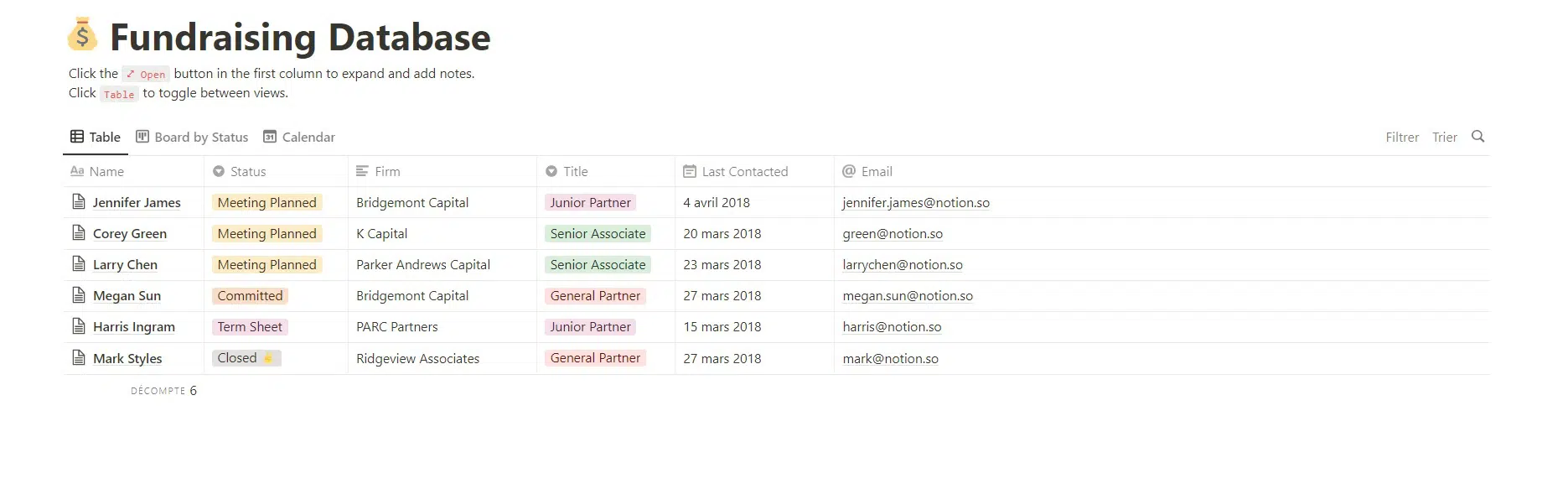 Chaque ligne s’ouvre dans une nouvelle page, où vous pouvez conserver toutes les notes prises lors des réunions, établir des listes de contrôle des éléments à suivre, intégrer des vidéos ou des podcasts, etc. Visualisez ce template sous forme de tableau, regroupé par statut, afin de voir quels investisseurs se trouvent à chaque étape de votre processus.