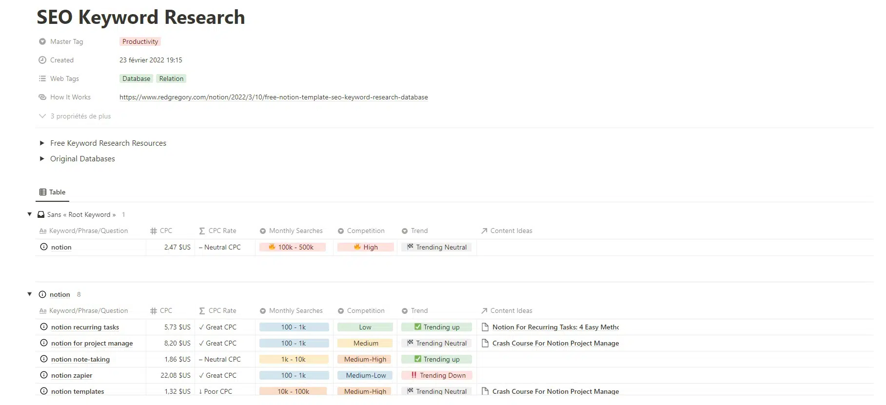 Transférez ces données dans ce template et associez les mots-clés pertinents au contenu dans votre calendrier de contenu ou votre gestionnaire de tâches. Si vous souhaitez travailler votre contenu dans une logique SEO, alors utilisez ce template pour gagner du temps et en efficacité.