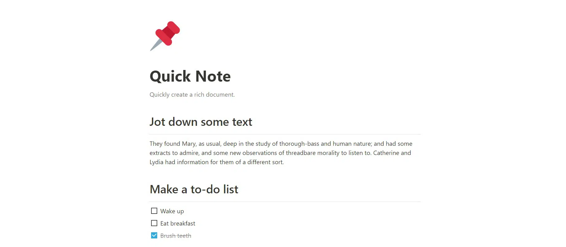 Il comprend une liste de tâches avec des cases à cocher, des signets Internet renvoyant à divers sites Web, des sous-titres et des sous-pages. Tous ces outils sont à votre disposition lorsque vous créez une nouvelle note dans Notion pour capturer au mieux les informations que vous trouvez utiles, à tous moments.