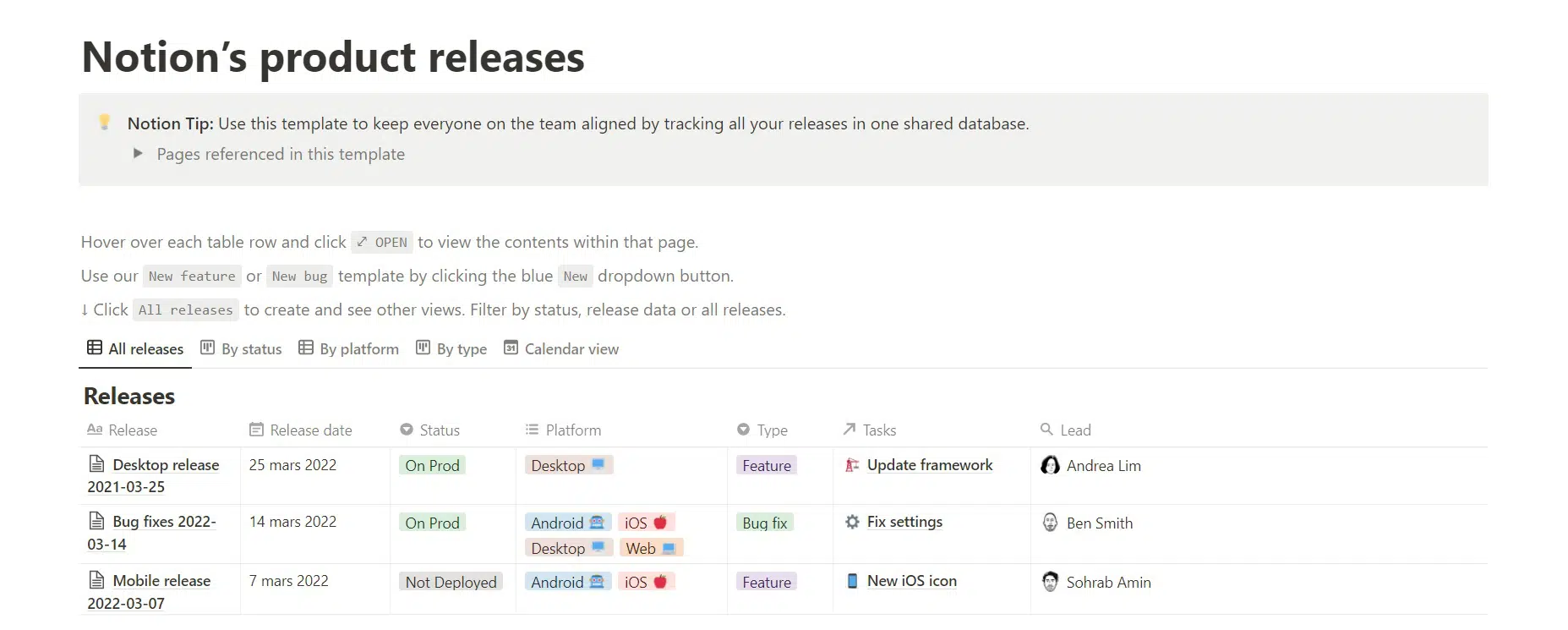 Filtrez facilement les versions de vos produits par plateforme, statut ou type, et utilisez des templates de base de données pour les nouvelles fonctionnalités et les corrections de bugs. Ce template est idéal pour aligner tous les membres d’une équipe et assurer le suivi de toutes les versions d’un même produit.