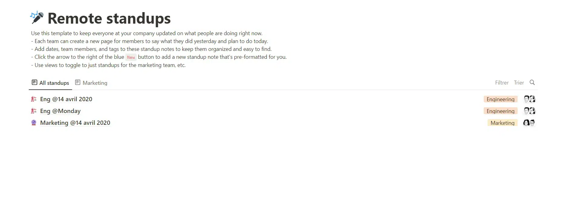 Utilisez ce template pour tenir au courant chaque membre de votre entreprise de ce que les gens font en ce moment. Chaque équipe peut créer une nouvelle page pour lister les tâches terminées, en cours ou à venir. Vous pouvez aussi ajouter des dates, des membres et des tags à ces notes de synthèse pour qu’elles soient organisées et faciles à trouver.
