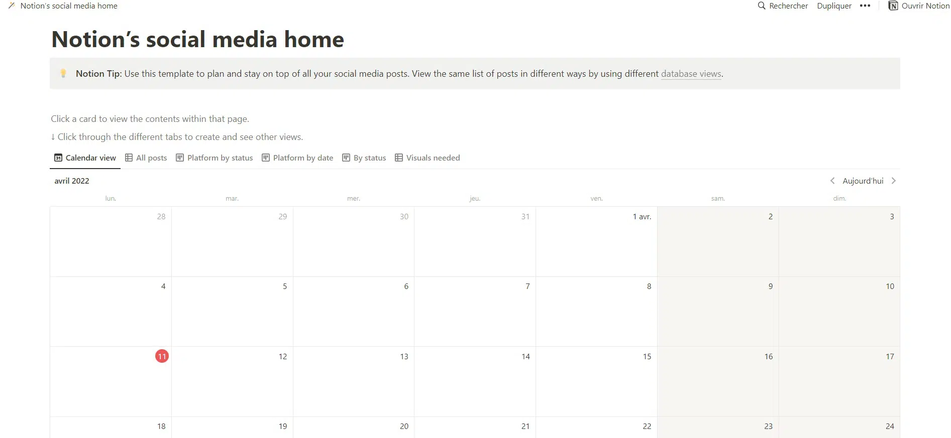 En tant qu’entrepreneur, vous êtes déjà probablement présent sur les réseaux sociaux. Pour organiser au mieux vos idées, vos publications, les différents réseaux sociaux sur lesquels vous êtes présents, utilisez dès maintenant ce template. Que ce soit pour créer, rédiger, planifier toutes vos publications, l’utilisation d’une seule base de données est fortement recommandé.
