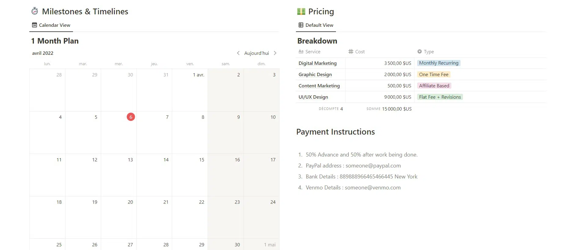 Vous retrouverez, dans ce template, une galerie des récents projets et/ou des services que vous proposez, une vue globale du calendrier, des instructions de paiement ou encore les termes et conditions de la proposition commerciale.
