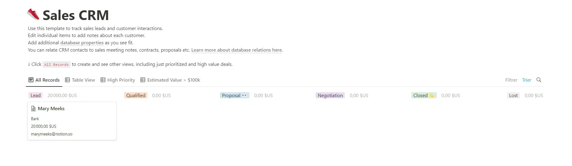 Si vous souhaitez suivre les leads et l’ensemble des interactions clients, ce template est fait pour vous. Votre entonnoir de vente n’a pas besoin de ressembler à un logiciel SaaS complexe et peu flexible. Notion vous propose ce template gratuit, facile à lire, pour définir uniquement les champs dont vous avez besoin pour suivre les leads. Pour des besoins avancés, l’intégration avec des outils CRM modernes comme HubSpot ou Pipedrive, désormais compatibles avec Notion via API, est de plus en plus courante.