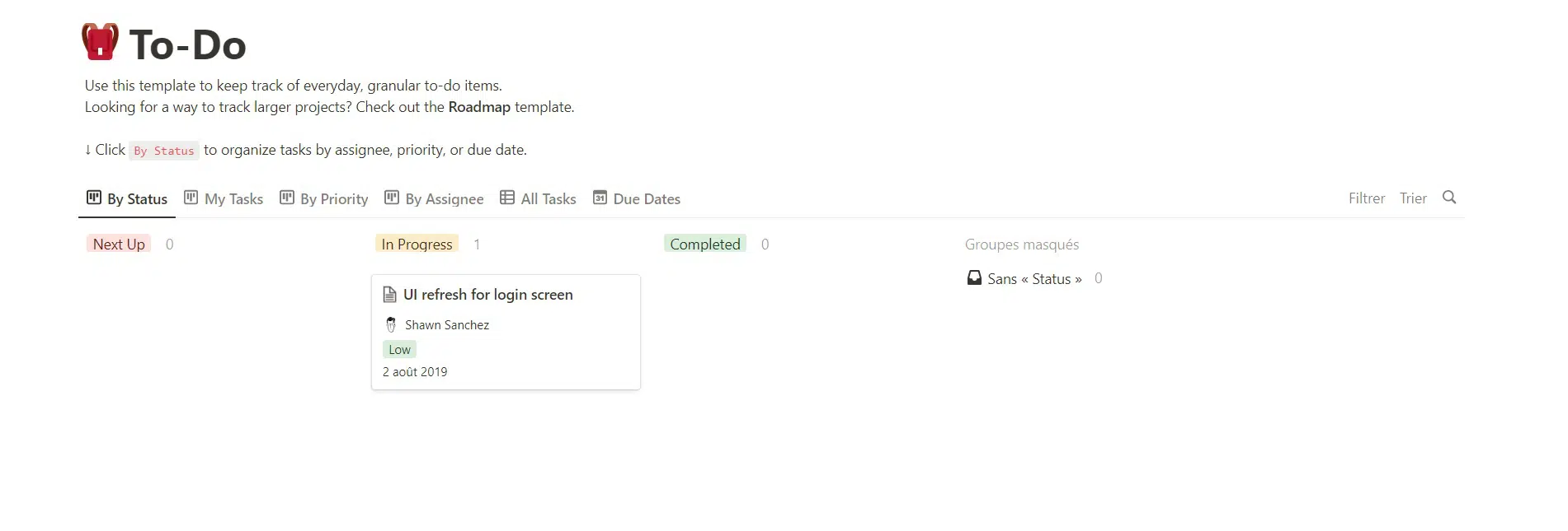 Ce template vous aide à organiser, gérer et suivre vos tâches quotidiennes, que vous travailliez seul ou en équipe. Vous pouvez notamment définir la priorité d’une tâche, sa date d’échéance, la personne à qui elle est confiée et son statut actuel (à faire, en cours, terminé).